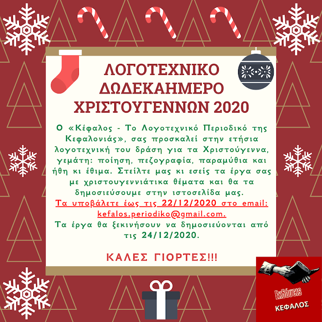 Στείλτε μας κι εσείς έργα σας με χριστουγεννιάτικα θέματα και θα τα δημοσιεύσουμε στην ιστοσελίδα μας. Τα υποβάλετε έως τις 22/12/2020 στο email: kefalos.periodiko@gmail.com.